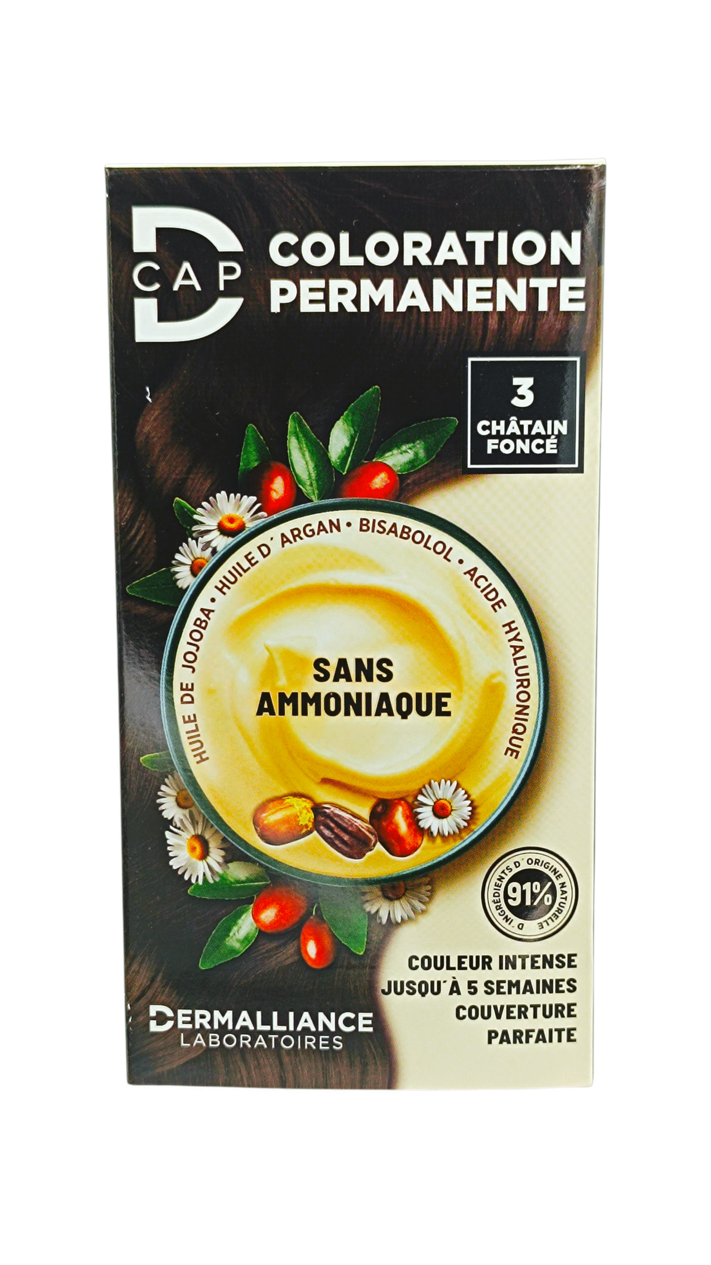D-CAP COLORATION 3 CHÂTAIN FONCÉ est une teinture capillaire conçue pour offrir une couleur châtain foncé intense et profonde. Ce produit est idéal pour celles et ceux qui souhaitent obtenir un résultat naturel tout en prenant soin de leurs cheveux. Voici une description détaillée du produit :