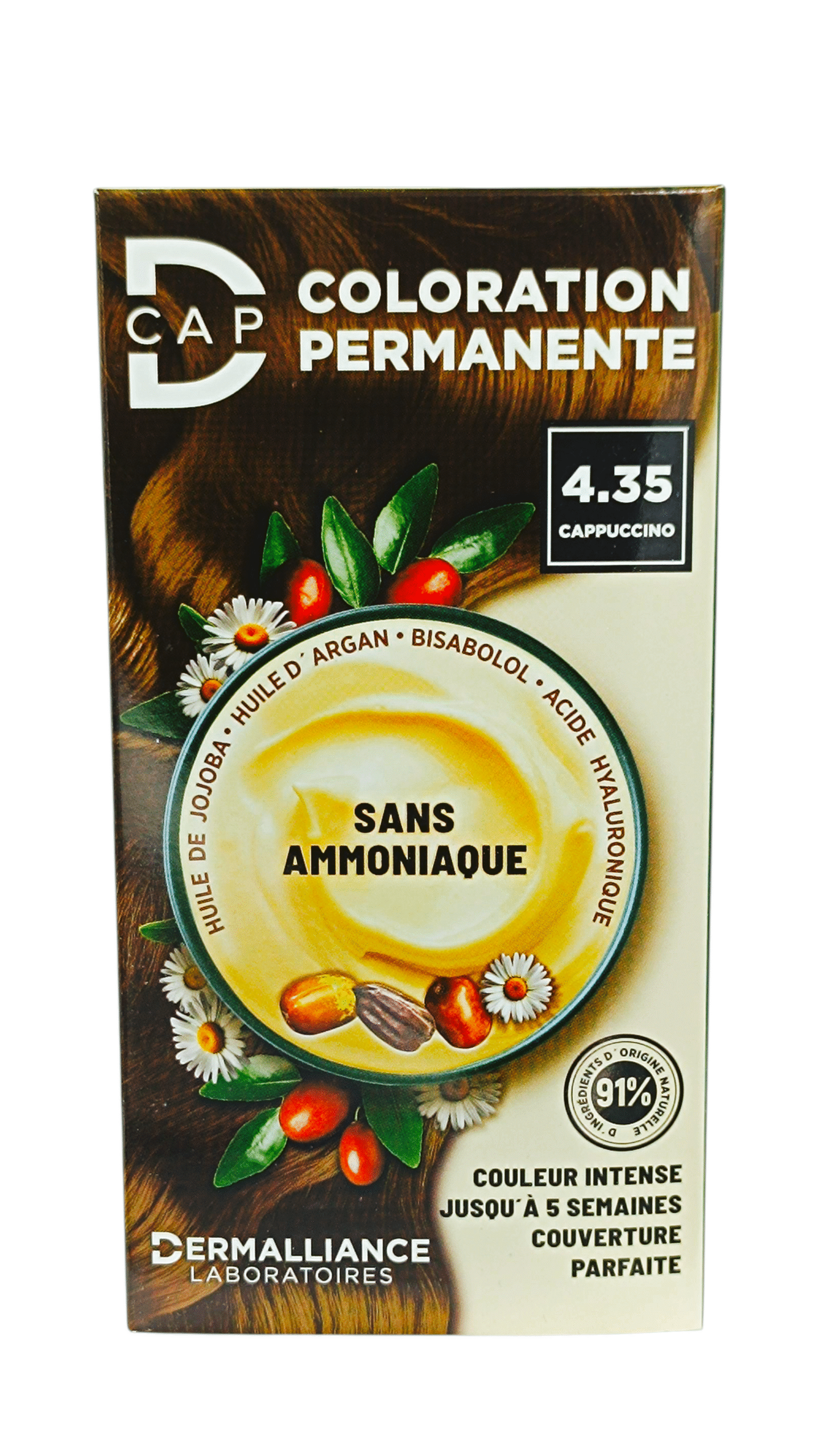 D-CAP COLORATION 4.35 CAPPUCCINO est une teinture capillaire qui offre une couleur cappuccino chaude et profonde, alliant des nuances de brun et de caramel. Ce produit est idéal pour ceux qui recherchent une couleur riche et élégante, avec des tons doux et naturels, tout en nourrissant et protégeant leurs cheveux. Voici une description détaillée du produit :