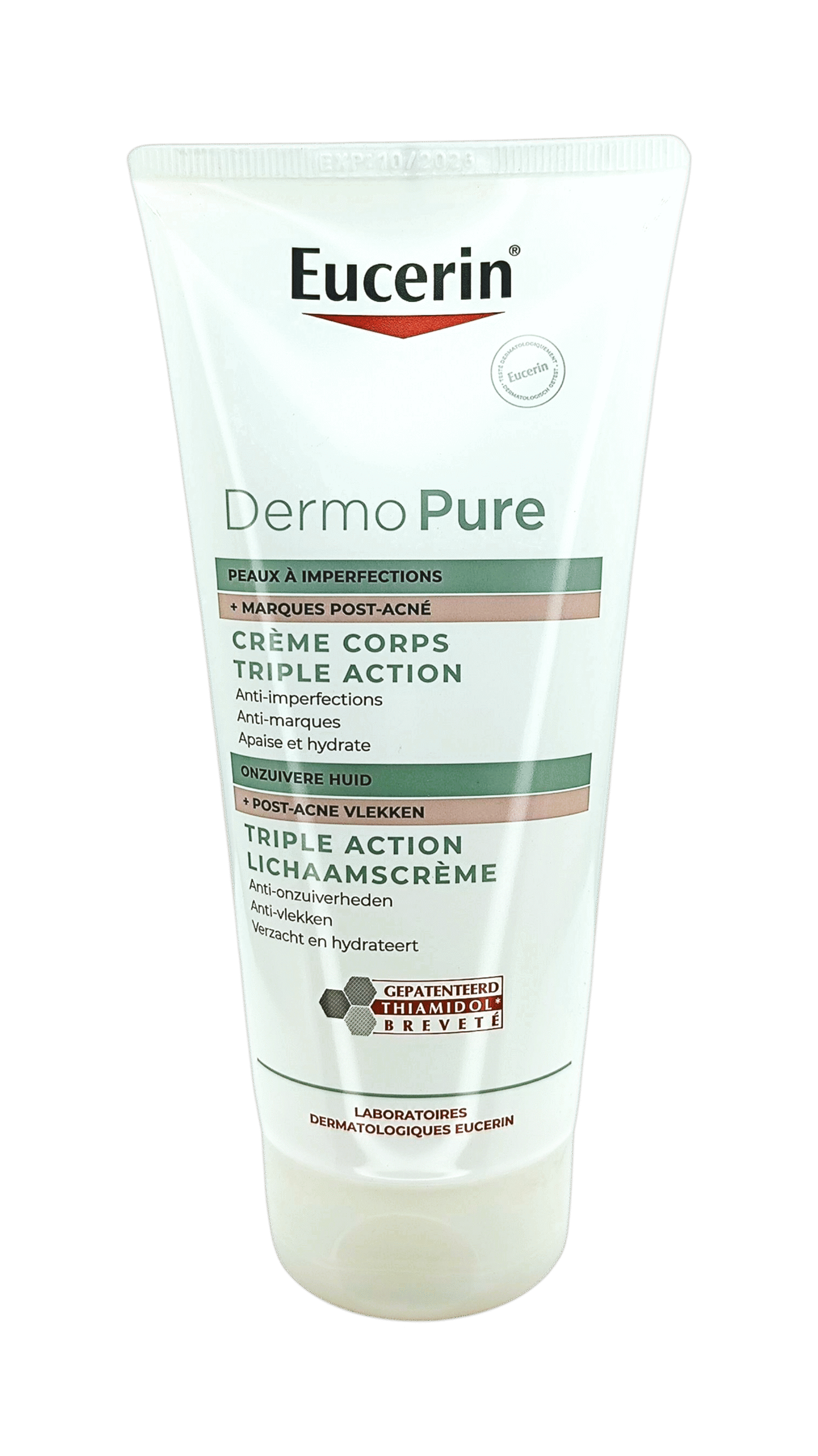 La Crème Corps Eucerin Dermopure Triple Action (200 ml) est un soin corporel conçu pour les peaux grasses et sujettes à l’acné, offrant une action ciblée pour améliorer l’apparence et la santé de la peau. Voici ses principales caractéristiques :