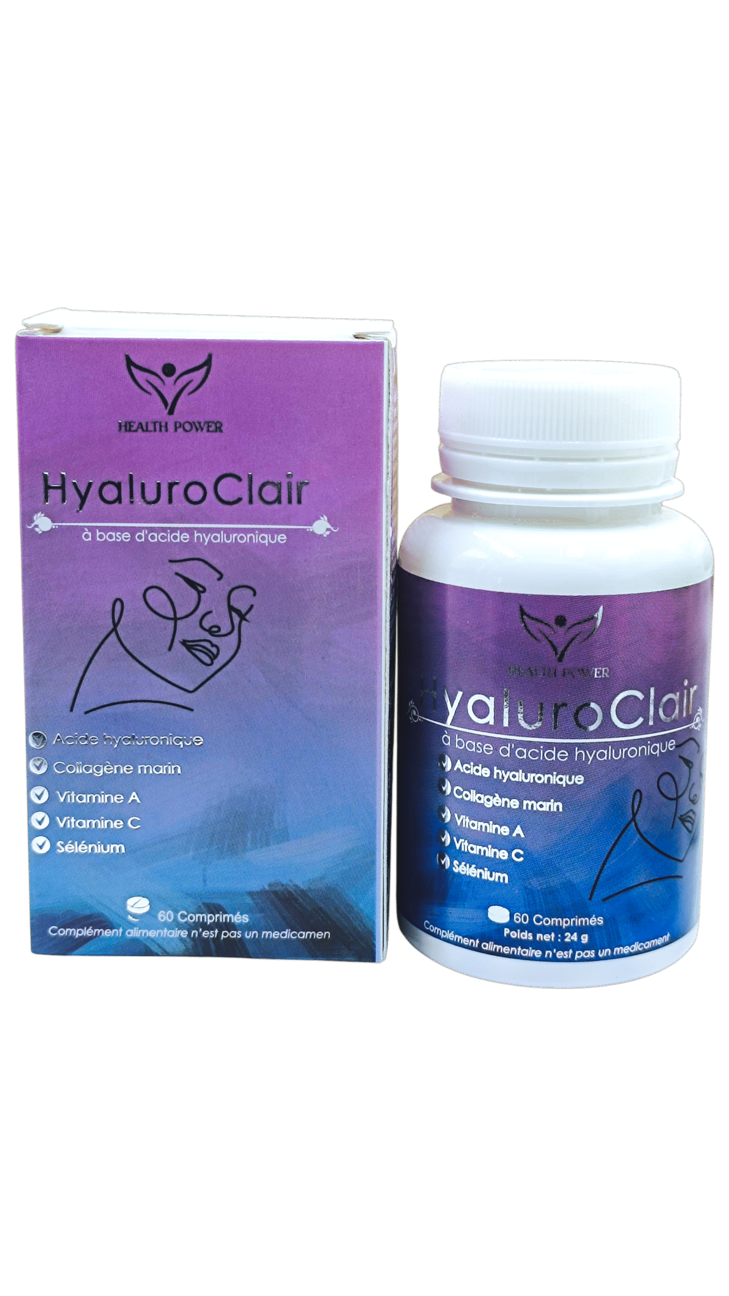 Le Health Power Hyaluroclair 60 comprimés est un complément alimentaire qui combine plusieurs ingrédients pour soutenir la santé de la peau, des articulations et des tissus conjonctifs. Voici une description générale de ce type de produit :