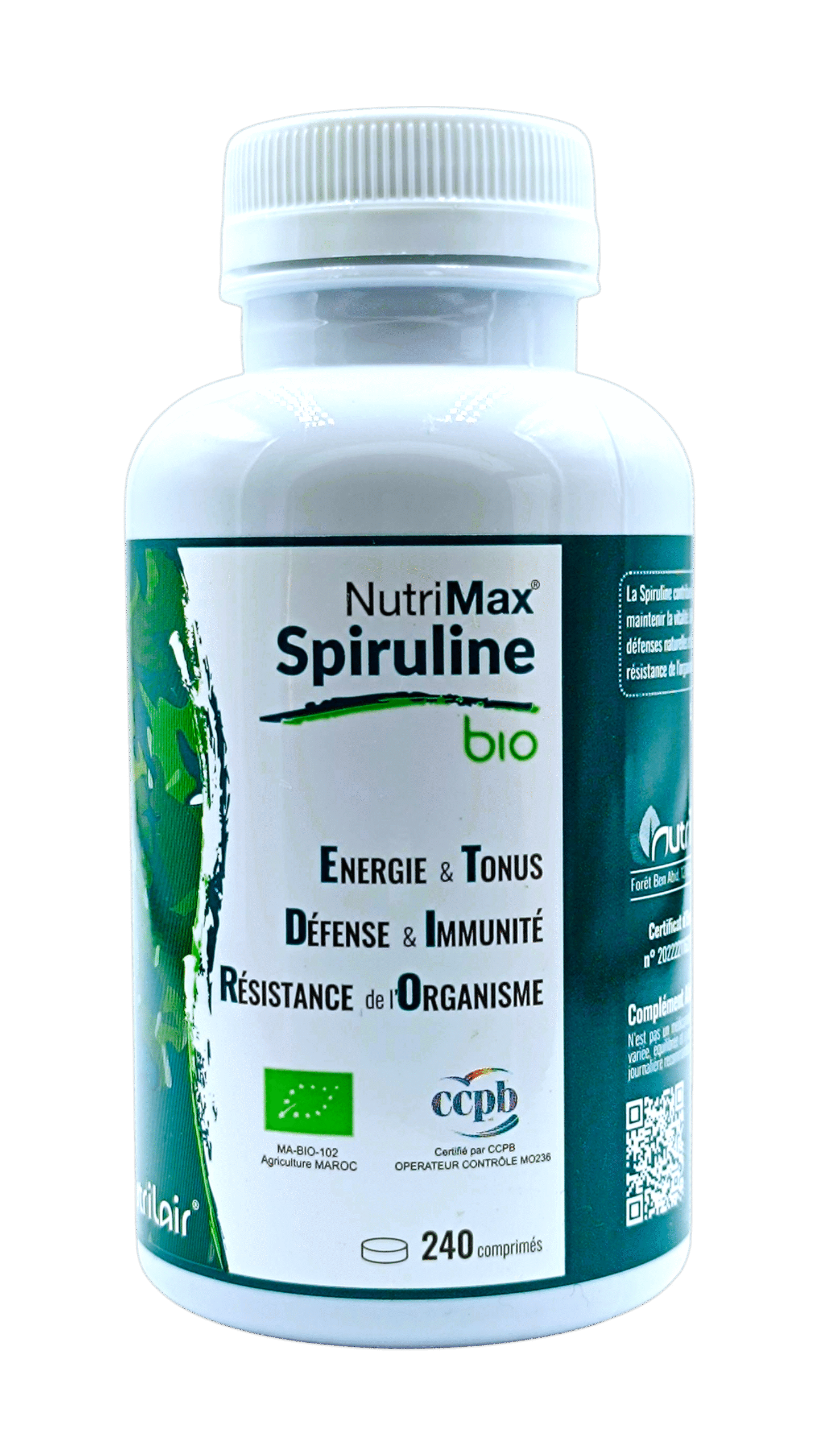 Nutrimax Spiruline Bio / 240 est un complément alimentaire à base de spiruline biologique, une micro-algue bleu-vert extrêmement nutritive et riche en protéines, vitamines, minéraux et antioxydants. Chaque flacon contient 240 comprimés de spiruline biologique, offrant une source naturelle et efficace de nutriments essentiels pour soutenir la santé générale, l’énergie et le bien-être.